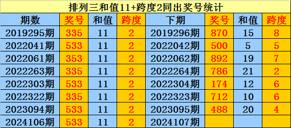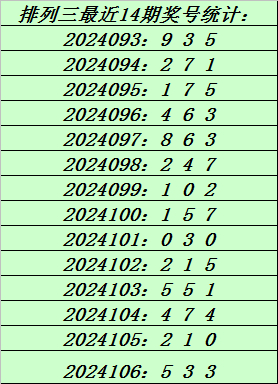 上期回顾:排列三第2024106期奖号:533。和值11,跨度2。