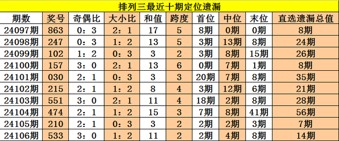开奖回顾:排列三第2024106期奖号:533,定位直选遗漏值2期、4期、8期,遗漏总值为14期。