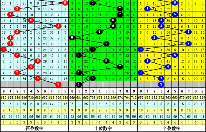 十位:奇数近期表现活跃,当前连续走冷了7期,本期预计奇数连续开出;另外,该位0路和1路号码在最近20期奖号中走势较热,2路号码表现相对较冷,本期该位放弃2路号码,参考号码1。