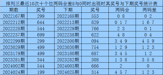 十个位合差分析:上期奖号十个位开出99组合,两码合为8,两码差为0,最近10次十个位两码合8与两码差0同时出现时,其奖号和下期奖号分别为: