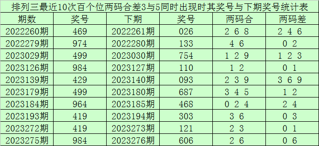 从以上统计可以看出,百个位两码合差3与5同时出现之后其下期两码合差表现最热的4个分别为:1236,本期百个位两码合差可以参考这四码中的数据。