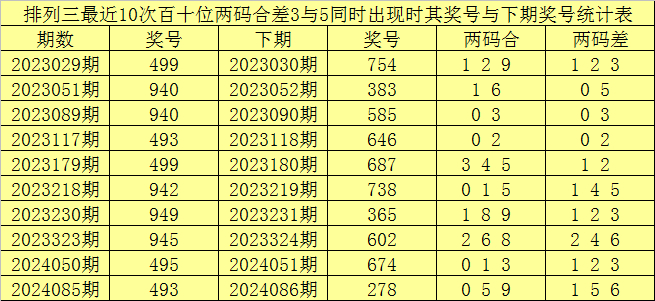 百十位合差分析:上期奖号百十位开出49组合,两码合为3,两码差为5,最近10次百十位两码合3与两码差5同时出现时,其奖号和下期奖号分别为: