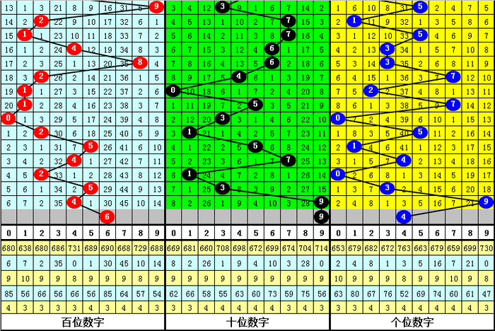 从以上统计可以看出,百十位两码合差3与5同时出现之后其下期两码合差表现最热的4个分别为:0123,本期百十位两码合差可以参考这四码中的数据。
