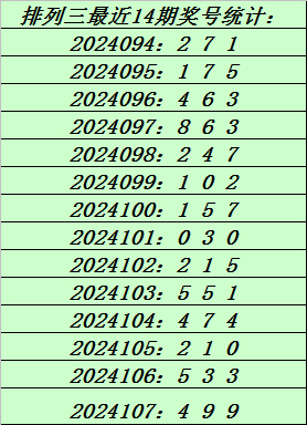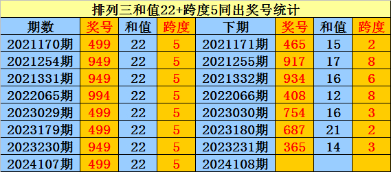 上期回顾:排列三第2024107期奖号:499。和值22,跨度5。