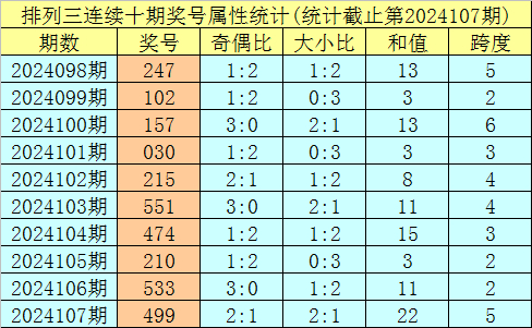 上期回顾:排列三第2024107期奖号:499。类型:组三,奇偶形态:偶奇奇,大小形态:小大大,和值:22,跨度:5。