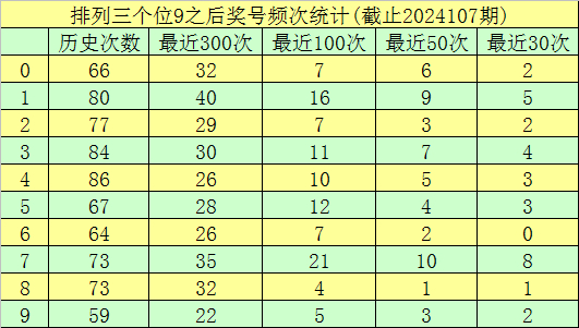 第三位杀号:第三位上期出现奖号9,该位历史上奖号9已开出了730次,最近100次第三位开出9时,下期号码0-9分别落号:号码7→21次,1→16次,5→12次,3→11次,4→10次,0、2、6→7次,9→5次,8→4次。