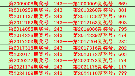 排列三第2024109期开出奖号243,该号码直选类型历史上出现了12次,前11次开出之后期下期奖号为:669、881、907、693、795、474、232、202、603、174、117,见下表: