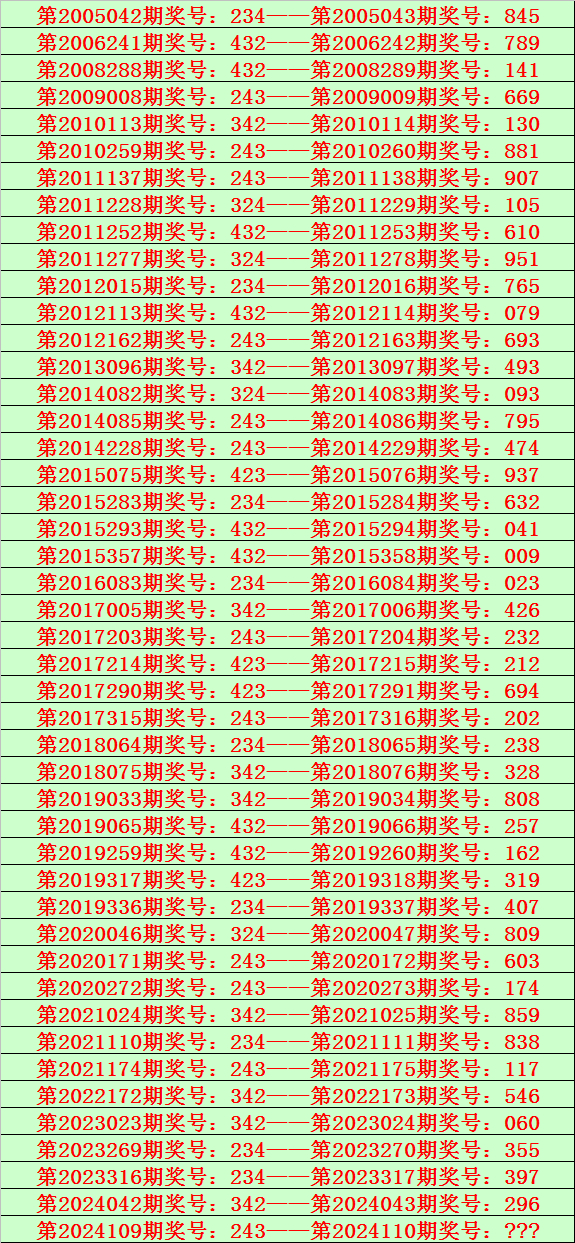 开奖回顾:体彩排列三第2024109期奖号为:243,类型:组六。