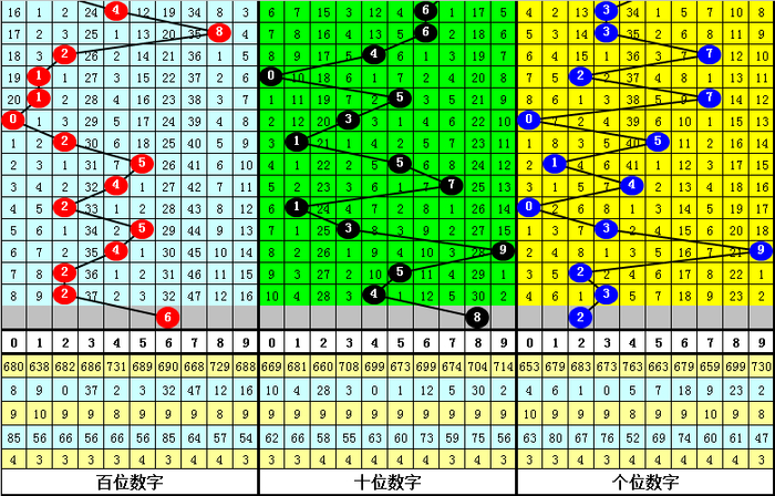 其中,百位奇偶比为4:7,大小比为6:5,本期百位一码参考6。