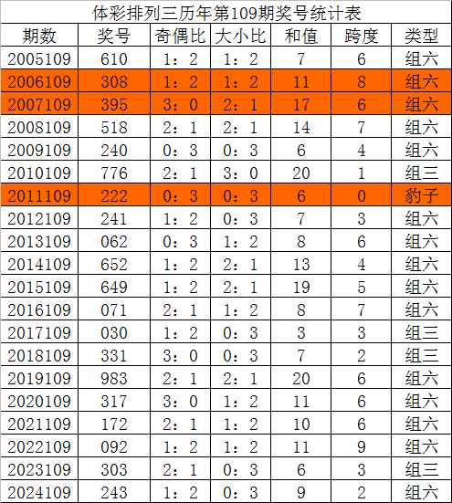 在历年排列三第110期开奖中:号码大小比为23:34,大号表现较冷,本期看好大号回补,大小比关注2:1。