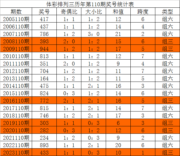 体彩排列三历年第110期开出奖号分别为:417、437、786、393、944、813、351、704、164、475、824、772、815、746、303、282、234、893、433。统计详见下表: