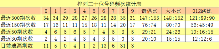 十位号码:前50期走势最活跃的号码为:5开出7个,1、3开出6个;走势最冷的号码为:8开出3个,0、6开出4个。十位号码012路比开出19:16:15,大小比开出24:26。本期十位排除两码:0、4,参考号码3、6、8,胆码关注6。