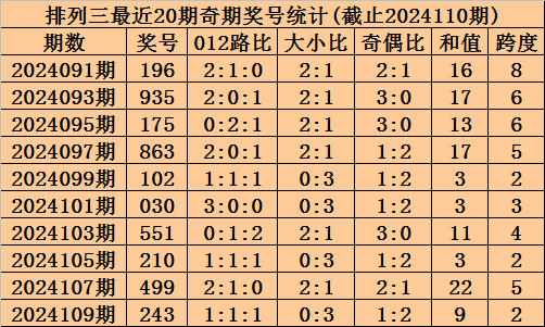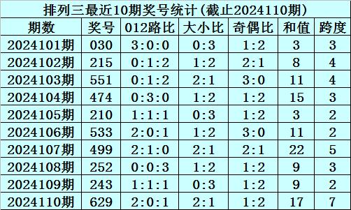 上期回顾:排列三2024110期奖号为629,奇偶比为1:2,大小比为2:1,跨度为17。