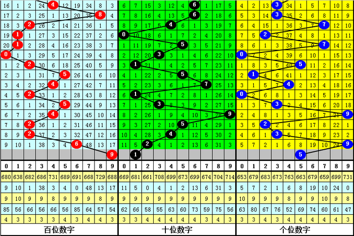 大中小分析:在组选0-9号码分布图中,前10期小号(0-2区段)出现12枚奖号,中号(3-6区段)出现14枚奖号,大号(7-9区段)出现4枚奖号,上期大中小区间分别出现1枚奖号,本期预计大中小区域各出1枚奖号。