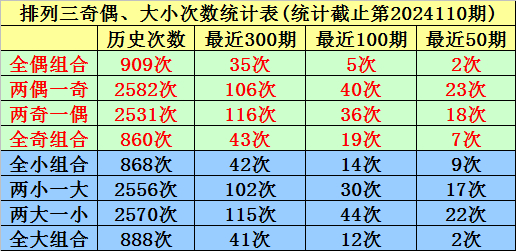 大小、奇偶分析:在连续40期奖号中,全大出现2期,当前遗漏31期、全小出现7期,当前遗漏1期、两小一大出现13期,当前遗漏2期、两大一小出现18期,当前遗漏0期,本期看好开出全大;全偶有2次,目前遗漏20期、两偶一奇有23次,目前遗漏0期、两奇一偶有18次,目前遗漏3期、全奇有7次,目前遗漏4次,本期预计出现两奇一偶。