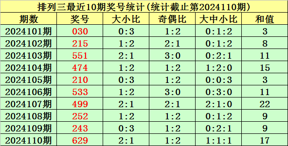 上期回顾:排列三第2024110期奖号为:629。奖号类型:组六,和值:17,奇偶比:1:2,跨度:7,大小比:2:1。