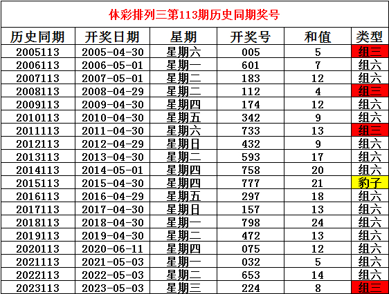 2024年5月2日排列三第113期开奖,历史同期分别开出奖号: