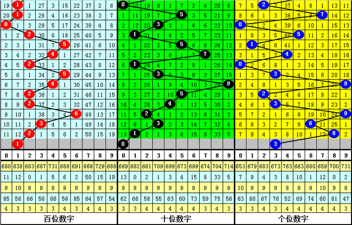 其中,号码奇偶比为34:23,偶数号码走冷;号码大小比为25:32,小号出现比例较高;号码012路比为18:22:17,1路号码走势活跃。