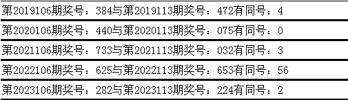 与前期历史同期奖号对比分析,在最近五年开奖中,第106期同期奖号与第113期同期奖号都出现了相同号码: