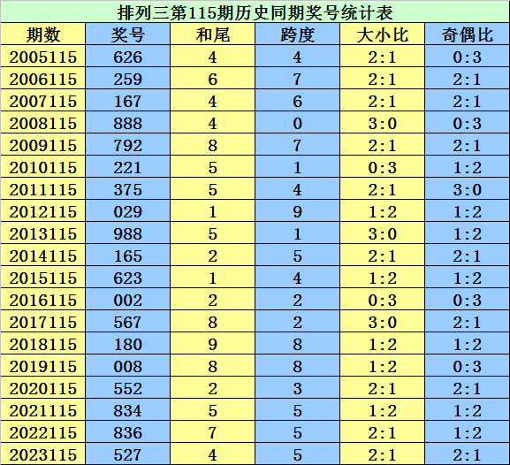 从2004年至今排列三已开出6886期奖号了,本期为排列三2024年第115期开奖,历史同期已出现19次奖号: