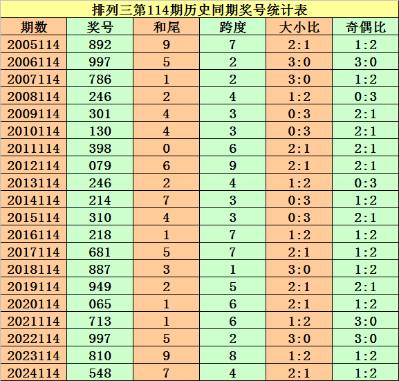 历年第114期排列三同期奖号开出:892、997、786、246、301、130、398、079、246、214、310、218、681、887、949、065、713、997、810、548。