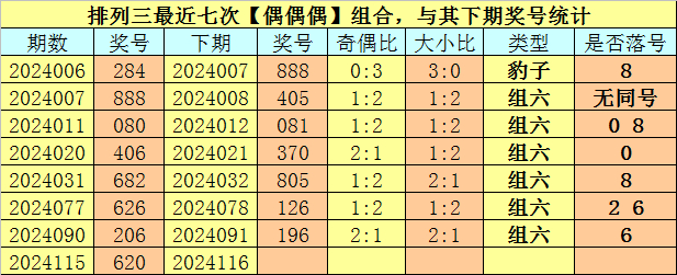 奖号类型分析:排列三最近七次【大小小】组合与【偶偶偶】组合出现之后,其下期豹子号码开出1次,组三号码开出1次,组六号码开出12次,其中组六号码开出频率非常热,本期预计继续开出组六号码。另外,其下期开奖有10期奖号包含了重号,本期预计继续开出重号,参考号码6。