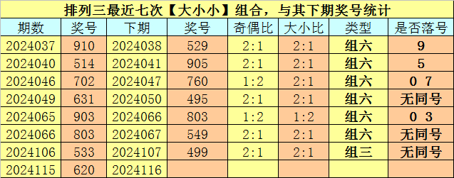 大小分析:排列三上期开出号码620,大小类型为【大小小】,最近七次开出大小类型大小小的奖号分别为:910、514、702、631、903、803、533,其下期分别开出号码:529、905、760、495、803、549、499。其中号码大小比为13:8,小号走势较冷,近期防止小号逐渐回补,本期重点关注小号,参考大小比1:2。