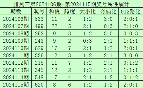 上期回顾:排列三第2024115期开奖号:620,奖号和值:8,奇偶比1:2,大小比1:2。