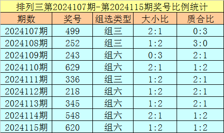 上期回顾:排列三第2024115奖号开出620,奖号质合比为1:2,大小比为1:2,跨度为6,类型为组六。