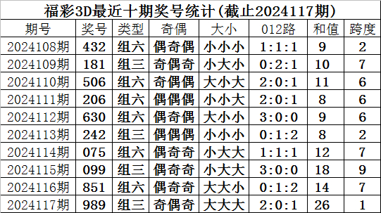 开奖回顾:福彩3D第2024117期奖号为989,奖号形态为:组三、大大大、2:0:1、奇偶奇。