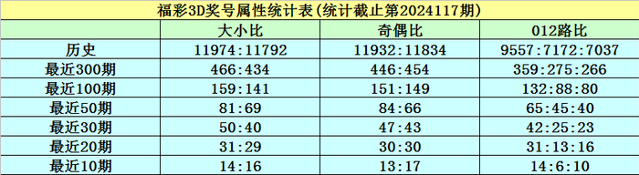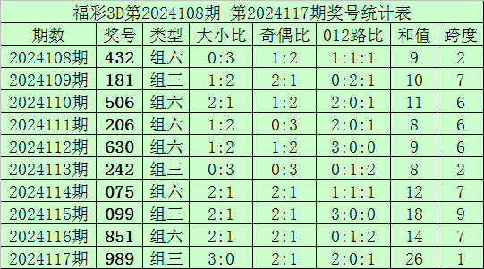 开奖回顾:福彩3D第2024117期奖号为989,其中奖号大小比为3:0,奇偶比为2:1,012路比为2:0:1,和值为26,跨度为1。