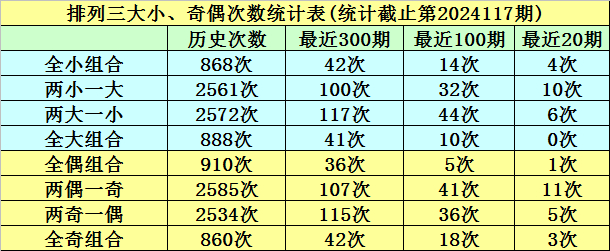 连续10期奖号中,两小一大形态开出6期,两大一小形态开出3期,全大形态开出0期,全小形态开出1期,本期大小形态判断:两大一小奖号。