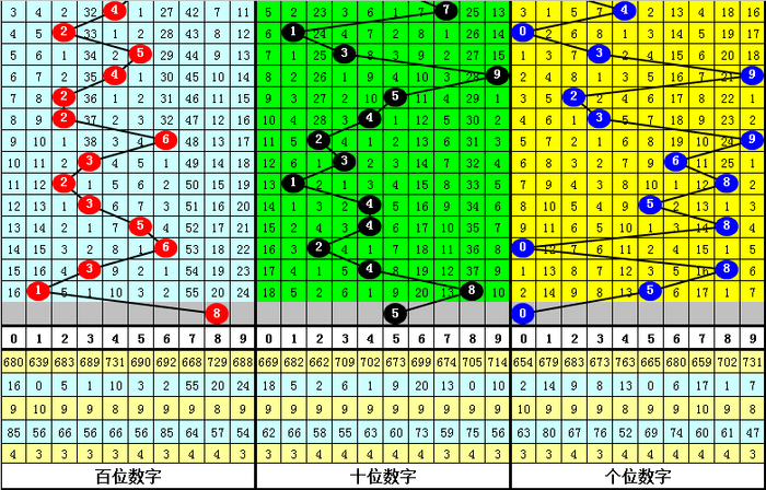 十位:奇数近期表现相对较冷,目前连续遗漏了5期,本期适当关注奇数号码回补;另外,在最近20期开奖中,十位以1路和2路号码表现活跃,0路号码走势相对较冷,本期看好0路号码继续走冷,参考号码5。