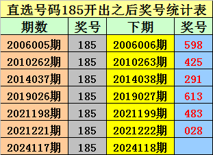 排列三直选185出现之后下期奖号分别为:598-425-291-613-483-028。