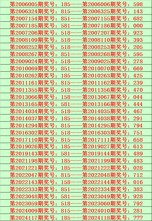 排列三第2024118期开奖日期:2024年5月7日,历史上第118期已开出了19次奖号,历年同期号码分别为:593、890、971、177、763、968、075、804、405、194、273、369、499、786、620、204、694、470、646。
