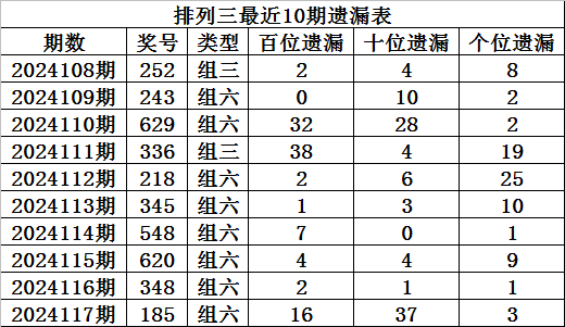 上期回顾:排列三第2024117期奖号:185,组六,直选遗漏总值为56期。