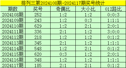 开奖回顾:排列三第2024117期奖号为:185,其奇偶比为2:1,大小比为2:1,奖号012路比为0:1:2。