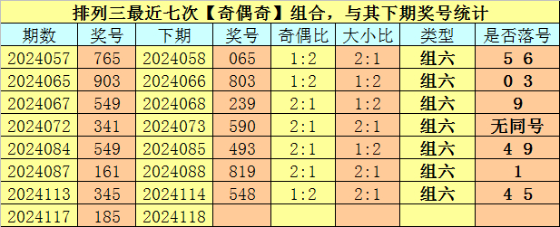 奇偶分析:排列三上期奖号为185,其奇偶类型为[奇偶奇],最近七次出现奇偶类型奇偶奇的号码分别为:765、903、549、341、549、161、345,其下期奖号分别为:765、903、549、341、549、161、345。其中号码奇偶比为11:10,奇偶奖号开出比例基本平衡,本期看好偶数号码转热,注意奇偶比1:2出现。