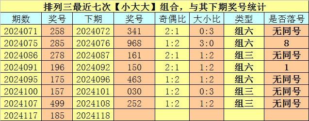 大小分析:排列三上期开出号码185,大小类型为[小大大],最近七次开出大小类型小大大的奖号分别为:258、285、278、196、175、157、499,其下期分别开出号码:341、968、161、150、463、030、252。其中号码大小比为7:14,大号开出比例较低,本期适当关注大号回补,预计开出2个大号。
