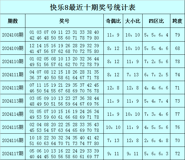 福彩快乐8第2024117期开奖回顾:05 06 10 13 16 22 24 29 33 39 40 44 45 50 56 58 60 61 69 77,其中奖号奇偶比开出9:11,大小比开出9:11,四区比开出5:6:6:3,跨度开出72。