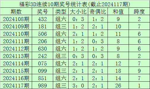 开奖回顾:福利彩票3D第24117期奖号开出989。奖号类型为组三,奇偶形态为奇偶奇,大小形态为大大大。