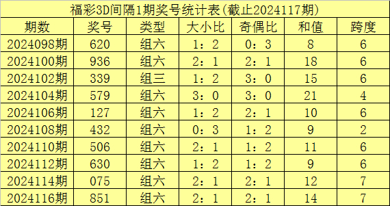 跨度:前5期跨度在1-9之间波动,振幅为9点,分布较广,上期开出跨度1,走低6点,本期预计跨度走高,关注跨度6。