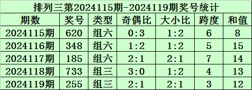 上期回顾:排列三第2024119期开奖号码为255。奖号类型为组三,奇偶比为2:1,大小比为2:1,跨度为3,和值为12。