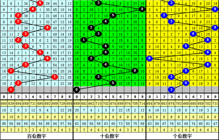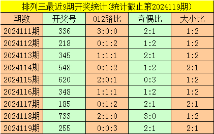 二、体彩排列三前9期奖号开出:336-218-345-548-620-348-185-733-255,其中奖号大小比为12:15,012路比为9:6:12,奇偶比为14:13;