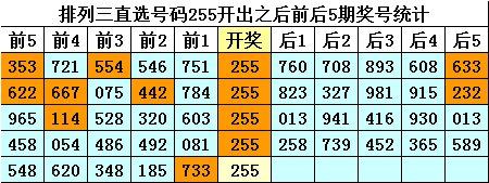 四、排列三直选号码255历史上开出5次,其前后五期奖号分别为: