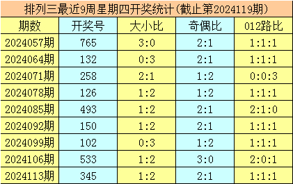 三、体彩排列三前9周星期四奖号分别开出:765-132-258-126-493-150-102-533-345,其中号码012路比为10:7:10,奇偶比为16:11,大小比为10:17;