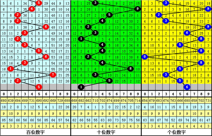 个位号码上期为5,质号,合号近期出现频次较高,最近连续遗漏了3次,走势相对较冷,本期注意合号回补,关注6。