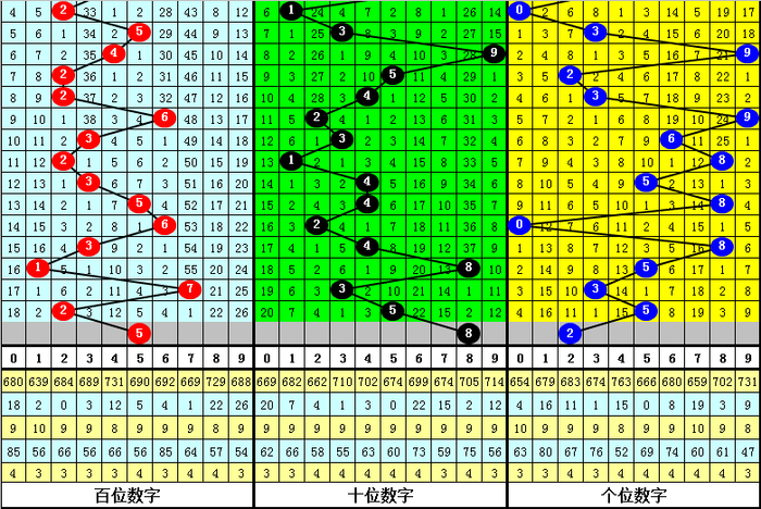 百位走势:近10期在1-7之间出号,跨度为7点,出号比较分散,上期奖号为2,下降5点,本期看好该位上升。另外近10期该位大小比为4:6,大号较冷,本期注意大号回补,关注号码5。
