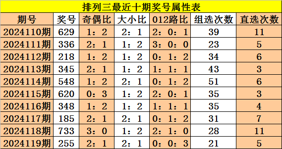 上期回顾:体彩排列三第2024119期奖号:255,奇偶比2:1,大小比2:1,012比0:0:3。