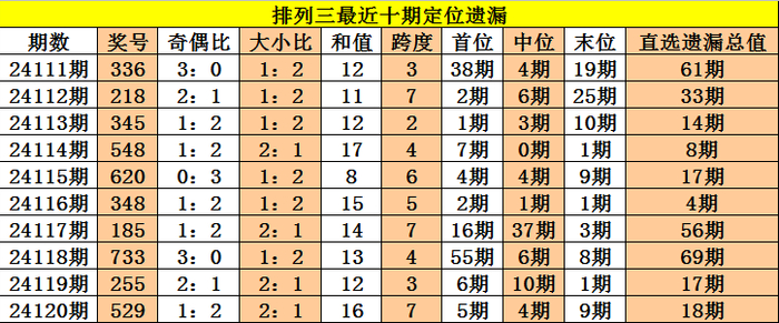 开奖回顾:排列三第2024120期奖号:529,定位直选遗漏值5期、4期、9期,遗漏总值为18期。